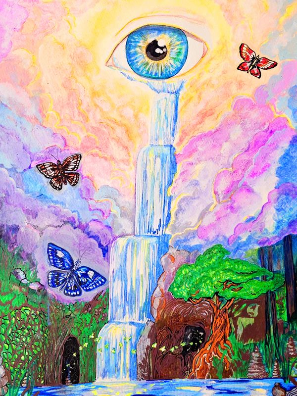 I dreamed of being an artist as a child, in addition to being a dolphin caregiver and astronomer/astrophysicist. My mother introduced me to the beauty of illustration, reading Jan Brett books with me and commenting on all the beautiful illustrated details, telling more and more with each further examination. In this, I found a creative force, at past times waning but ultimately insatiable. My work is likely influenced by my lifelong want to create beautiful painted and illustrated worlds. Alice in Wonderland, A Wrinkle In Time, the Simpsons, Reading Rainbow, the Beatles, and the Grateful Dead, all joined in part for the development of my love of dreamscapes, psychedelic and mystical concepts, music, a love of nature, and outer space, and my ever-guiding, perpetual state of wonder and openness to the magic, love, and beauty of existence that surrounds us at all times. At age 13, on a whim of interest and seeking some semblance of direction on my path, I brought the copy of "Siddhartha" that had been sitting on a bookshelf in my parent's basement to Prospect Harbor, Maine on our family vacation.